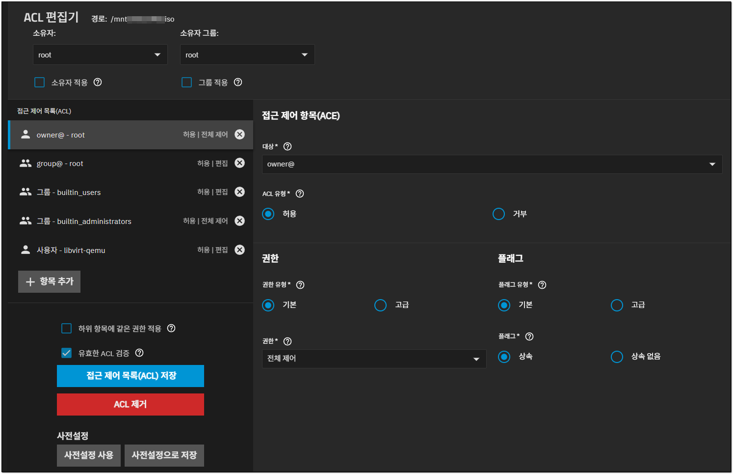 데이터 세트 > 수정 > iso 폴더 ACL에 사용자 - libvirt-qemu 권한 추가.