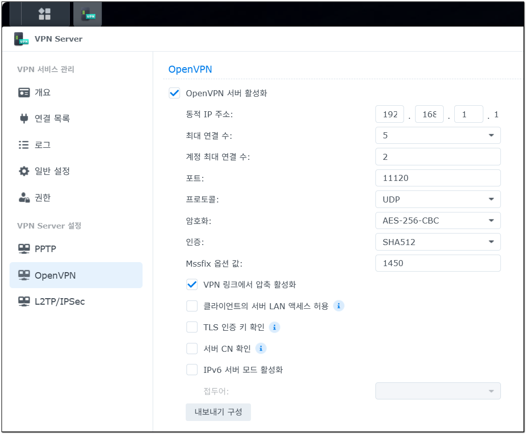 OpenVPN의 대표 포트인 11120을 공유기에서 오픈해 주고 시놀로지에서 VPN을 구성하는 방법으로 진행.
