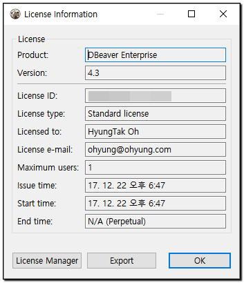 구매 할때 COMMUNITY2017 입력하면 DBeaver EE License $49.50 USD 로 구매 가능