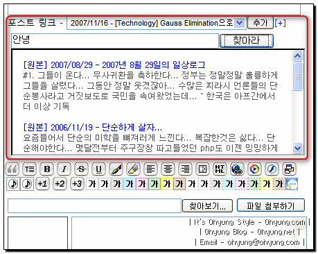 태터툴즈 클래식용 과거글 링크 넣기 Tech · 07/11/16 23:11 오랜만에 시간이 나서 그동안 리스트만 나오던 '과거 포스트 링크 달기' 클래식용 버젼을 고치는 중입니다.일단 이전에 만들었던 TT와 TC용을 보면서 수정하는데...역시 자바 스크립트에서 또 무수한 에러가;;;일단 이번에도 파이어 폭스에서만 잘 돌아가면 장땡!리눅스와 xp에서 잘 돌아가니까!데레데레... 오랜만에 php 코딩 고고싱!